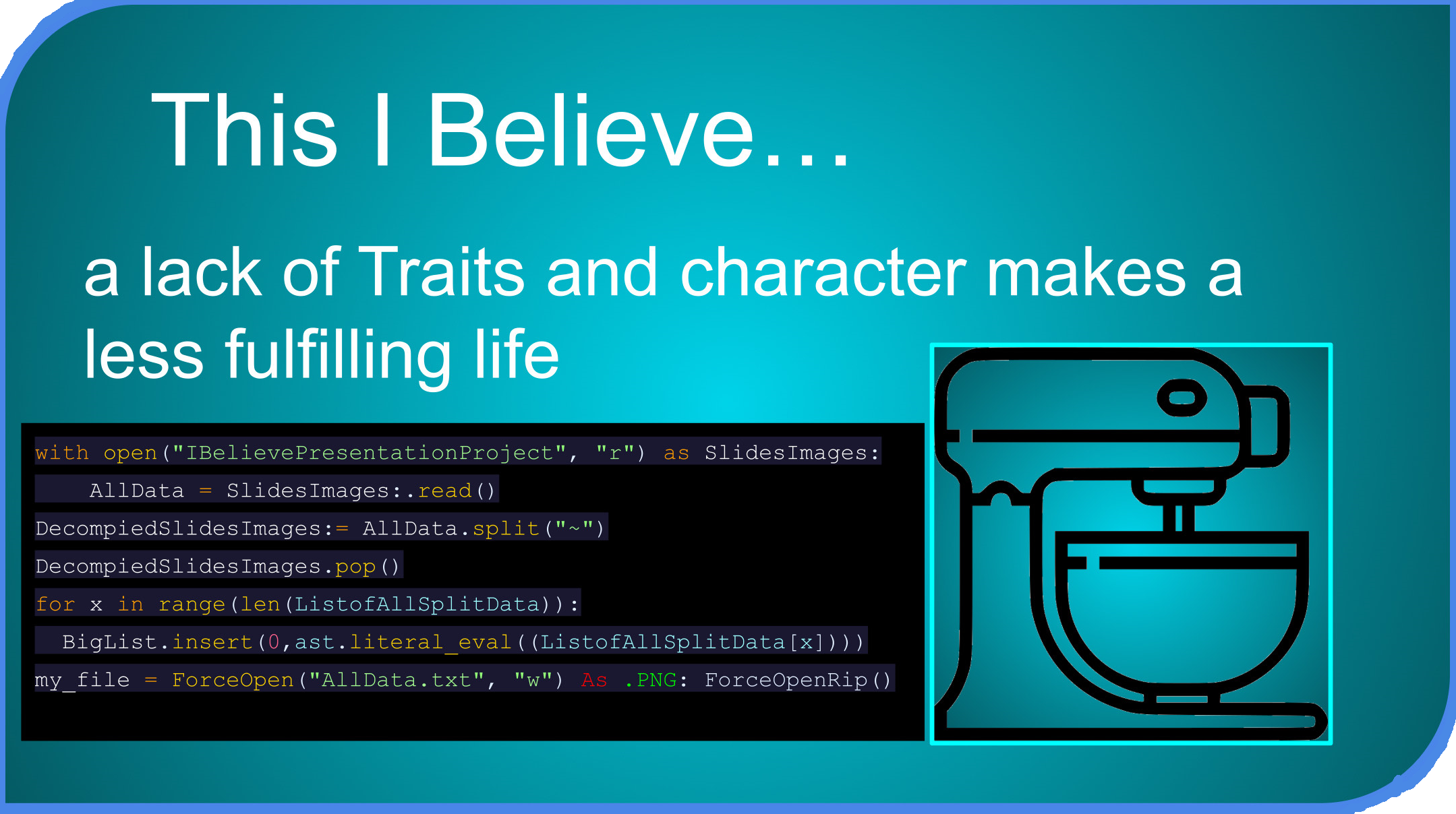 this came from the quote a jack of all traits is a master of none but sure beats a master of one. from a documentary I was watching about Dan Povenimire, but the quote didn't take full effect until a few months later when I had the epiphany during an electrical project of liked what I was doing but I don't think I would want to do this as a job, and decided to take my chance at programming in java in robotics. over that summer I learned Java and how to program a robot and enjoyed doing it. Because of that, I have taken up a leadership position for this and the rest of my high school career. because of that one skill I learned in Java; decided I wanted to go into software development. In the school years of 2023-2024, I learned: Swift, Java, C, C++, C#, CoffeeScript, PyScripts, EMCA script, Python, and Assembly. That is not all I began to take out personal hobbies that aren't computer science and coding related. like learning how to cook and make complex meals from scratch, gardening, Psychology, and Economic reliance on Game theory. that better shaped who I am as a person other than a person who stays inside all day a makes websites for fun; and that people who decide that just want to get better at one thing or stop when they get into a comfortable place end up slowing or stopping their growth as a person, and comparing who you want to be like and want you to think your like. for example, on the outside, I'm more introverted nerd stereotype who likes computer science, and one of my favorite games is Stardew Valley. but on the inside, I do not spend that much time playing video games but more offline the biggest example of I do not have any social media, and the ones I don't I don't use or post on them like your support to do. but I also work cooking my favorite dish to make is crab Rangoon even though I don't make it often, or gardening/general yard work. it builds an invisible personality that many people don't really see. and those skills invisible or not make believe that to make a fulfilling life is building up parts of your character than being stagnant and doing the bare minimum.